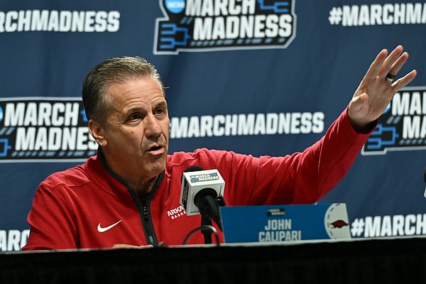 March 20, 2026 at 5:40 p.m. Arkansas coach John Calipari speaks with reporters, Friday, March 20, 2026, during a press conference before the Razorbacks' NCAA Tournament second-round game vs. High Point at Moda Center in Portland, Ore. (Hank Layton/ …